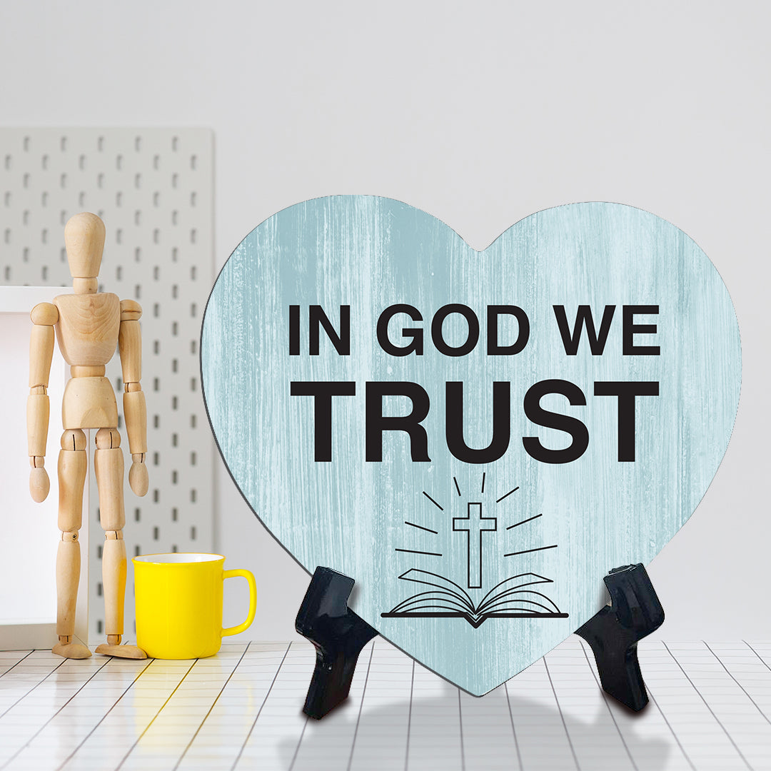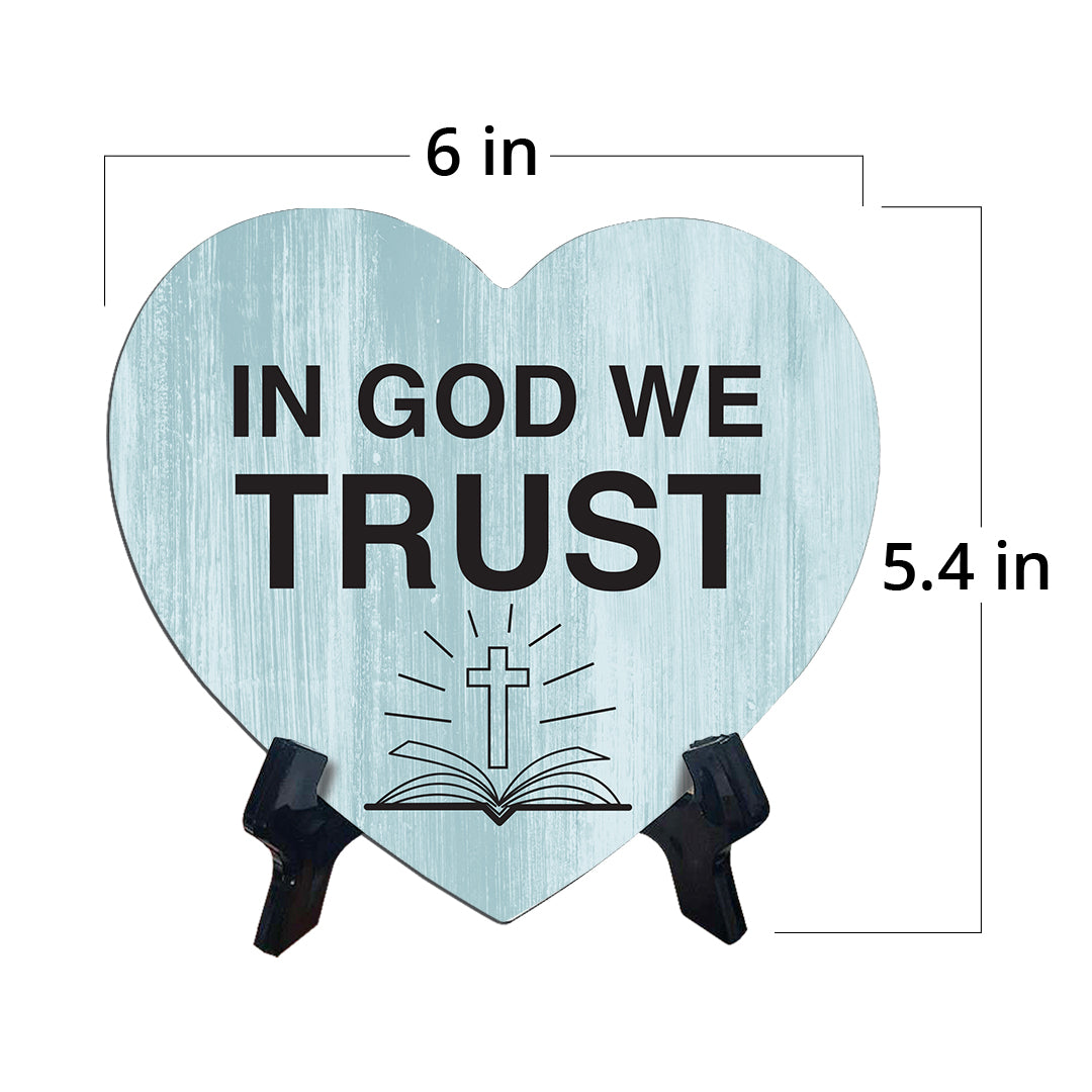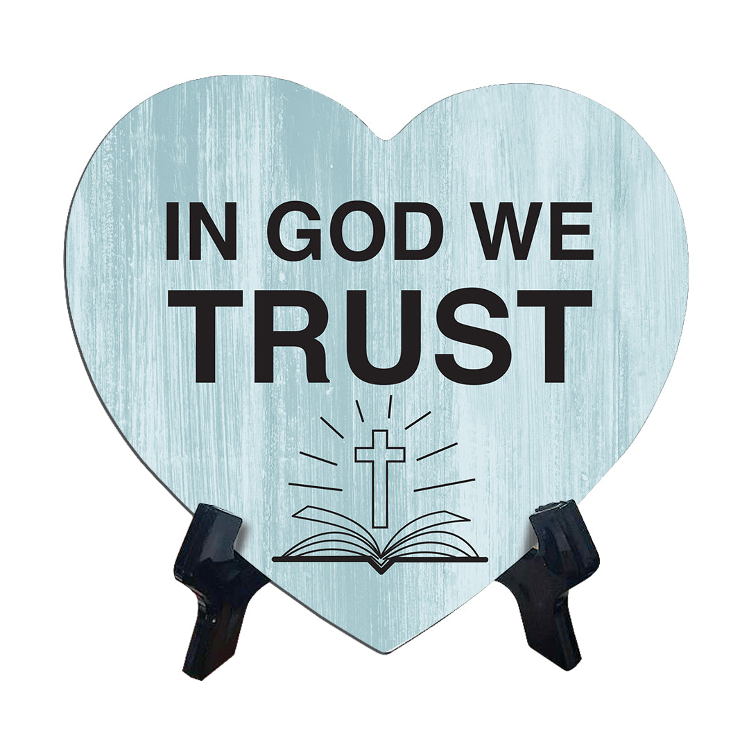 In God we trust, Wood Color, Heart Table Sign. This table sign comes with it's own black acrylic easel, easy to set up and display on any flat surface.