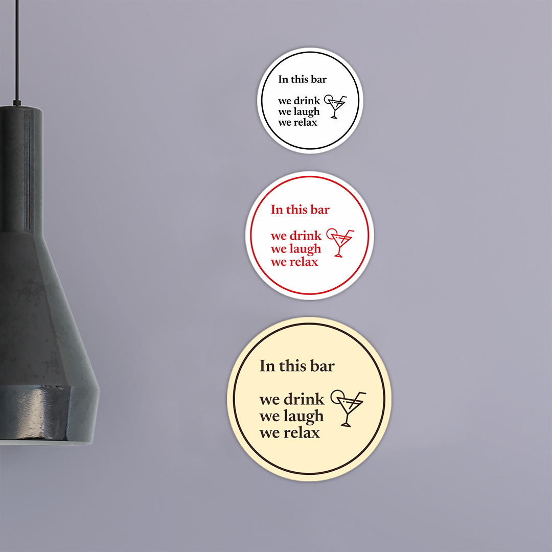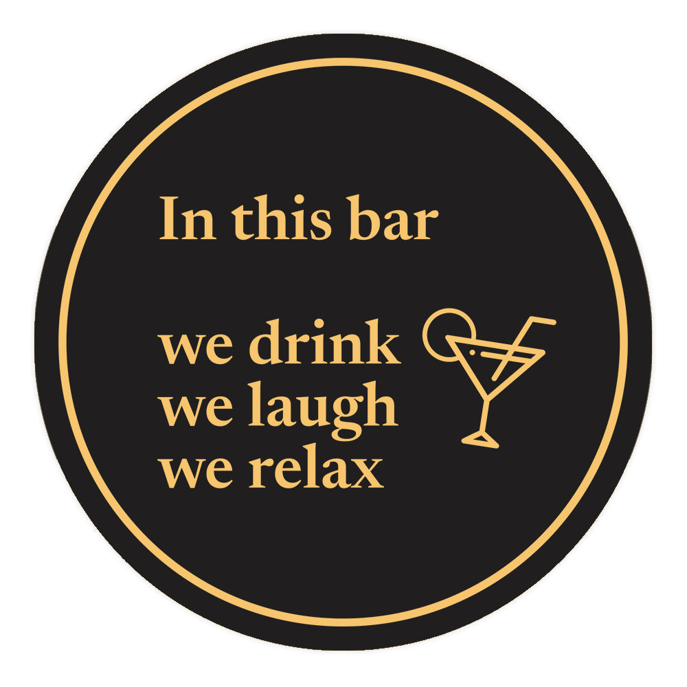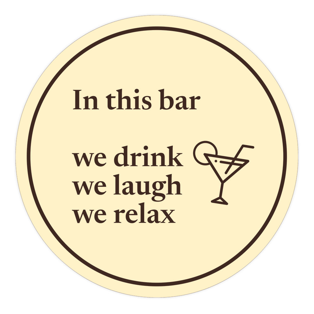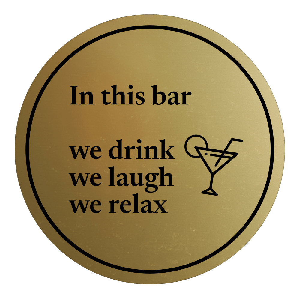 Our Signs ByLITA Circle In this Bar, We Drink, We Laugh, We Relax ABS Plastic ' Laser Engraved ' Easy Installation ' Elegant Design Sign can be attached to the door, wall or window of your home or business. The sign text and design work is laser engraved into sturdy plastic. Each sign comes with an adhesive foam backing, allowing them to be attached to any flat surface. Comes in multiple colors. Our bar/pub signs are great for your home or business.
