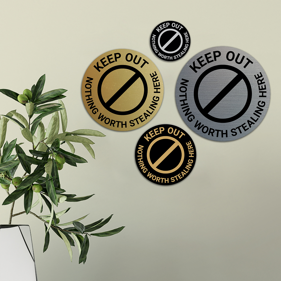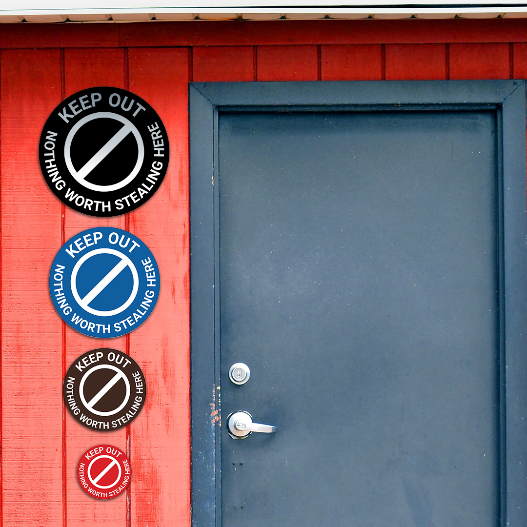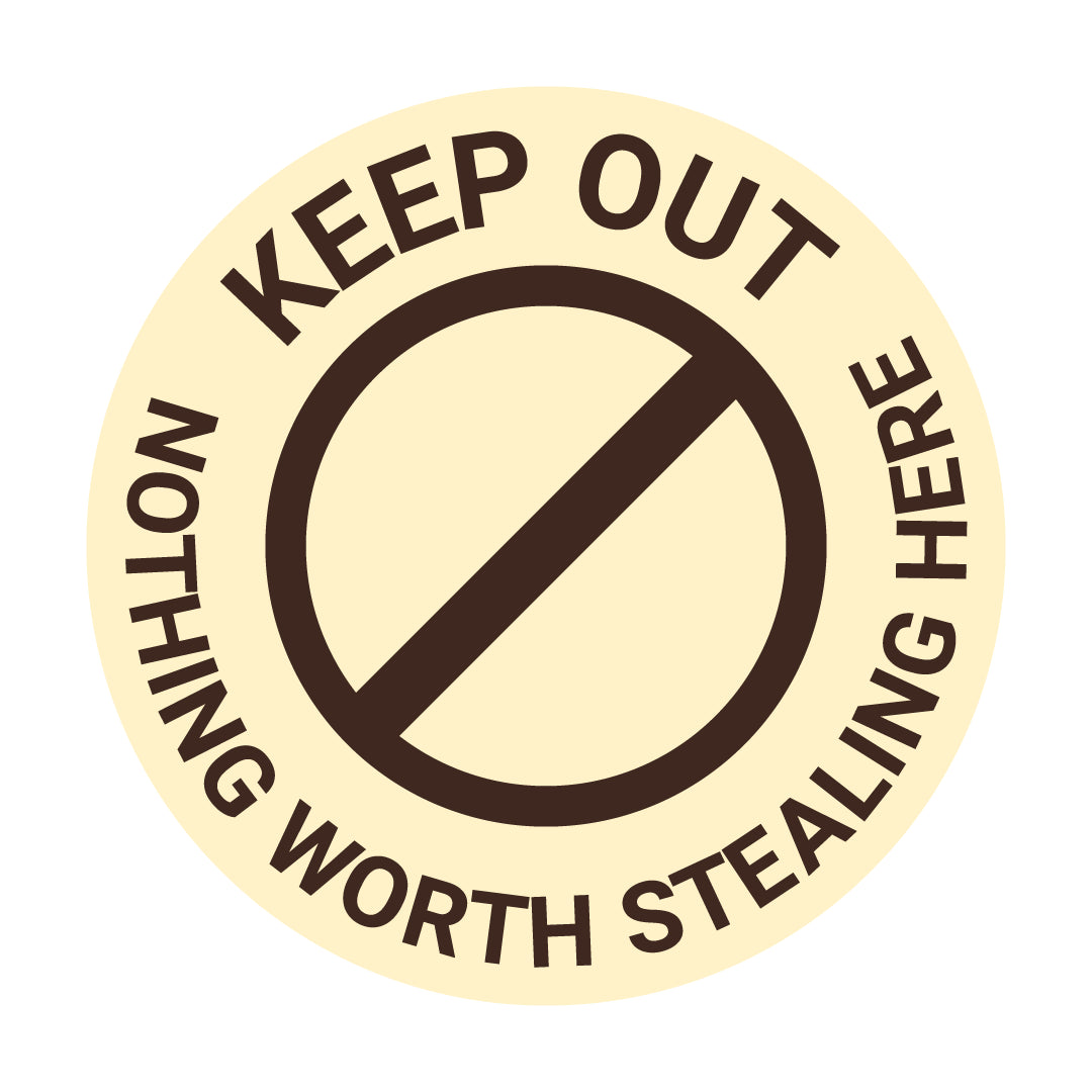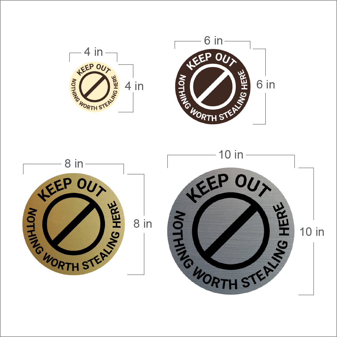 Our Signs ByLITA Circle Keep Out Nothing Worth Stealing Here Sign can be attached to the door, wall or window of your home or business. The sign text and design work is laser engraved into sturdy plastic. Each sign comes with an adhesive foam backing, allowing them to be attached...