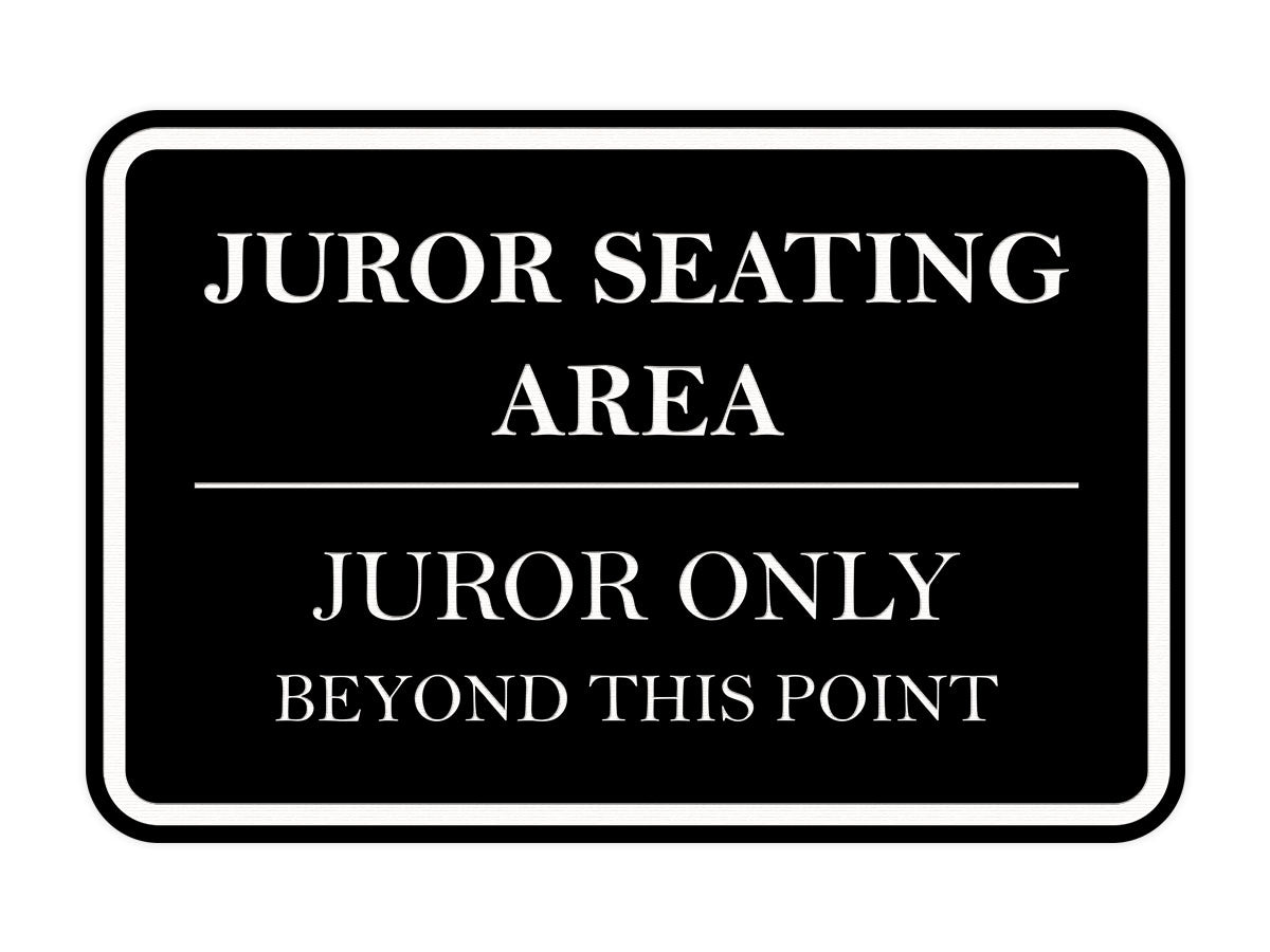 Our Signs ByLITA Classic Framed Juror Seating Area. Juror Only Beyond This Point Sign can be attached to the door, wall or window of courtroom or courthouse. The sign text and design work is laser engraved into sturdy plastic. Each sign comes with an adhesive foam backing, allowing them to be attached to any flat surface. Comes in multiple colors. Our courtroom signs are great for courthouse or office.