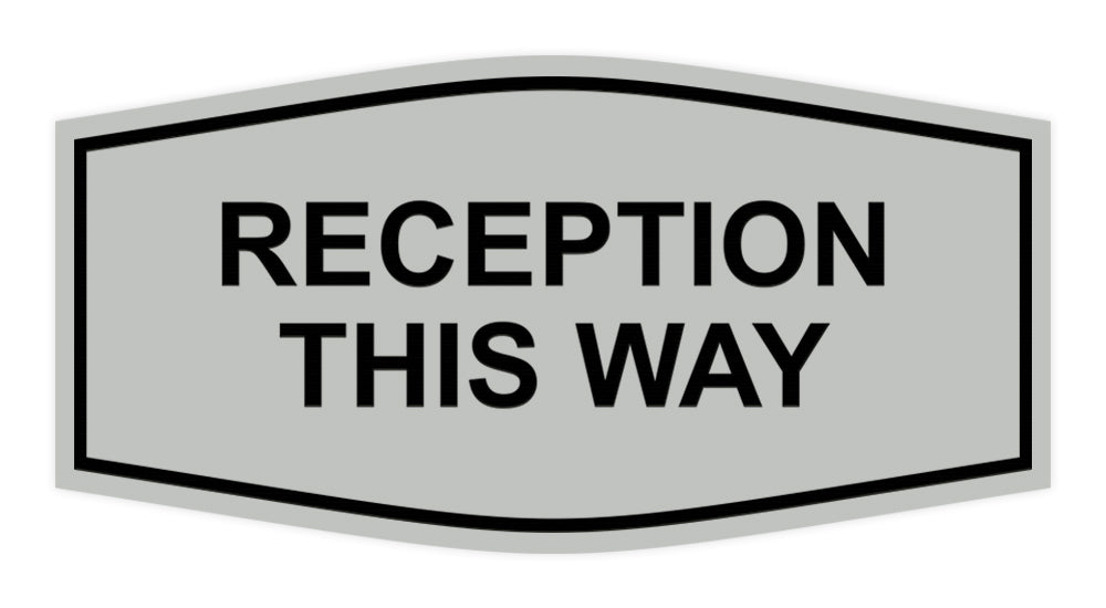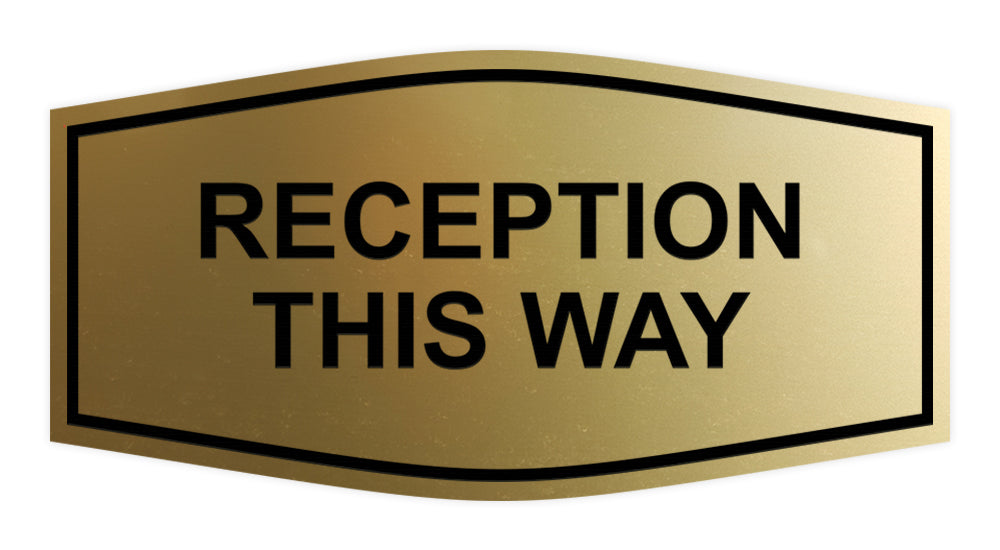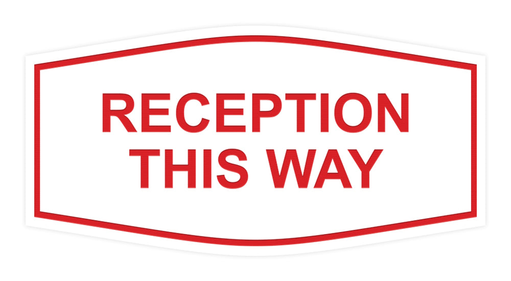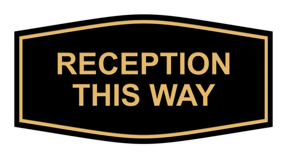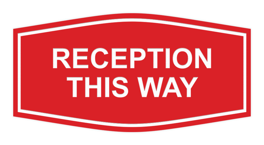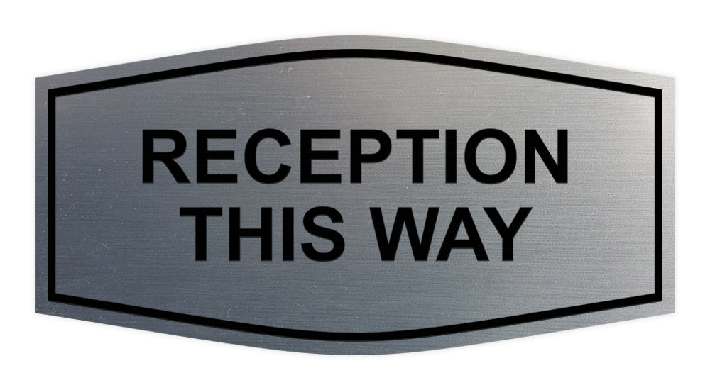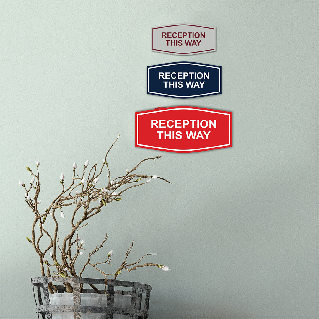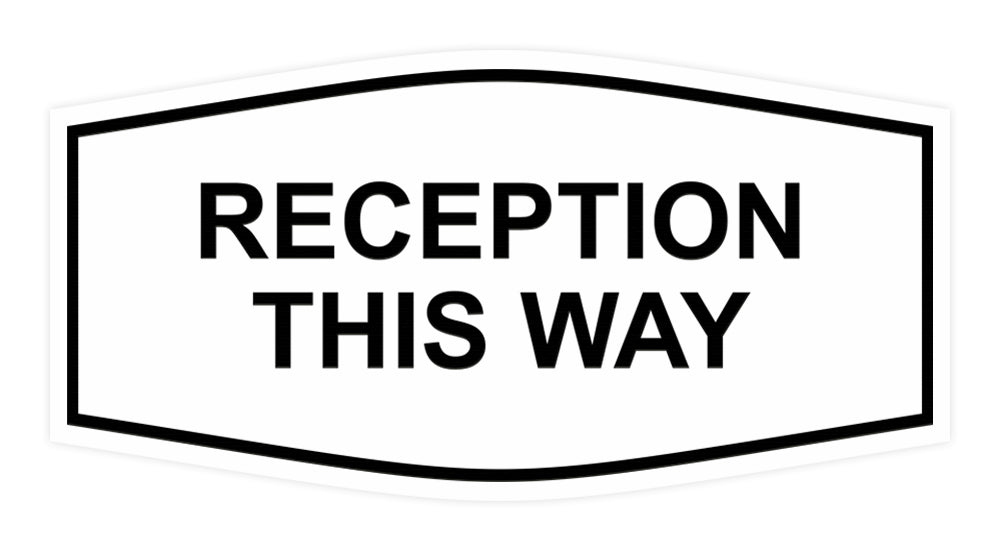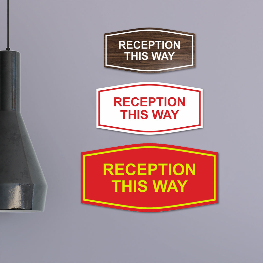 Our Fancy Reception This Way/Wall sign can be attached to the door, wall or window of your home or business. The sign has been laser engraved so the words are all etched into the plastic. Comes in multiple colors. Small sign is 3"H X 6" W, Medium sign is 3.5"H...