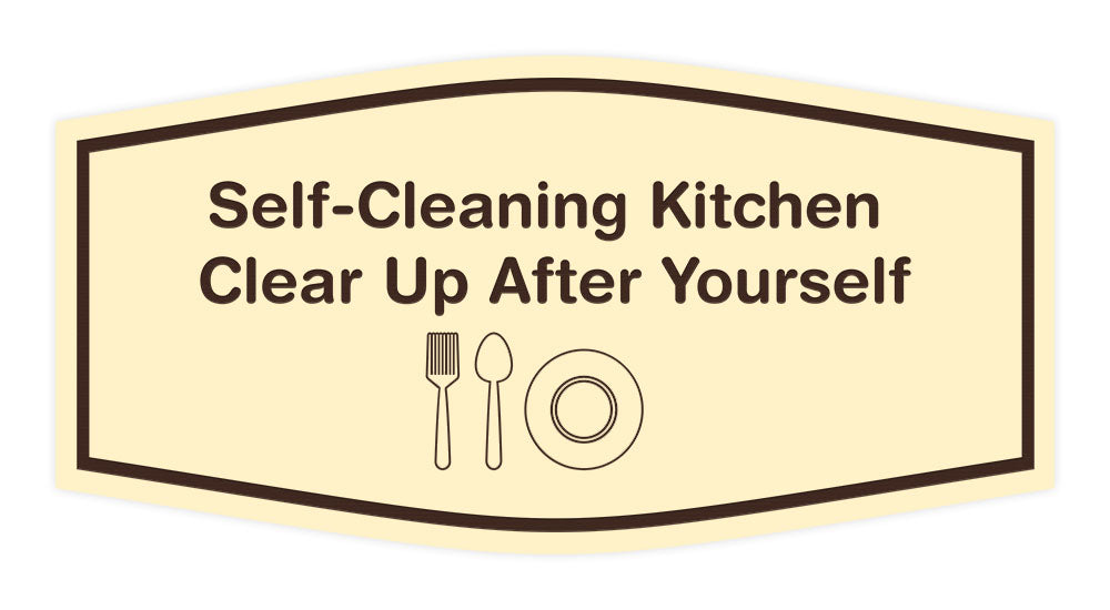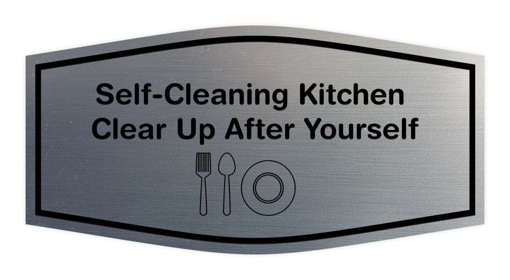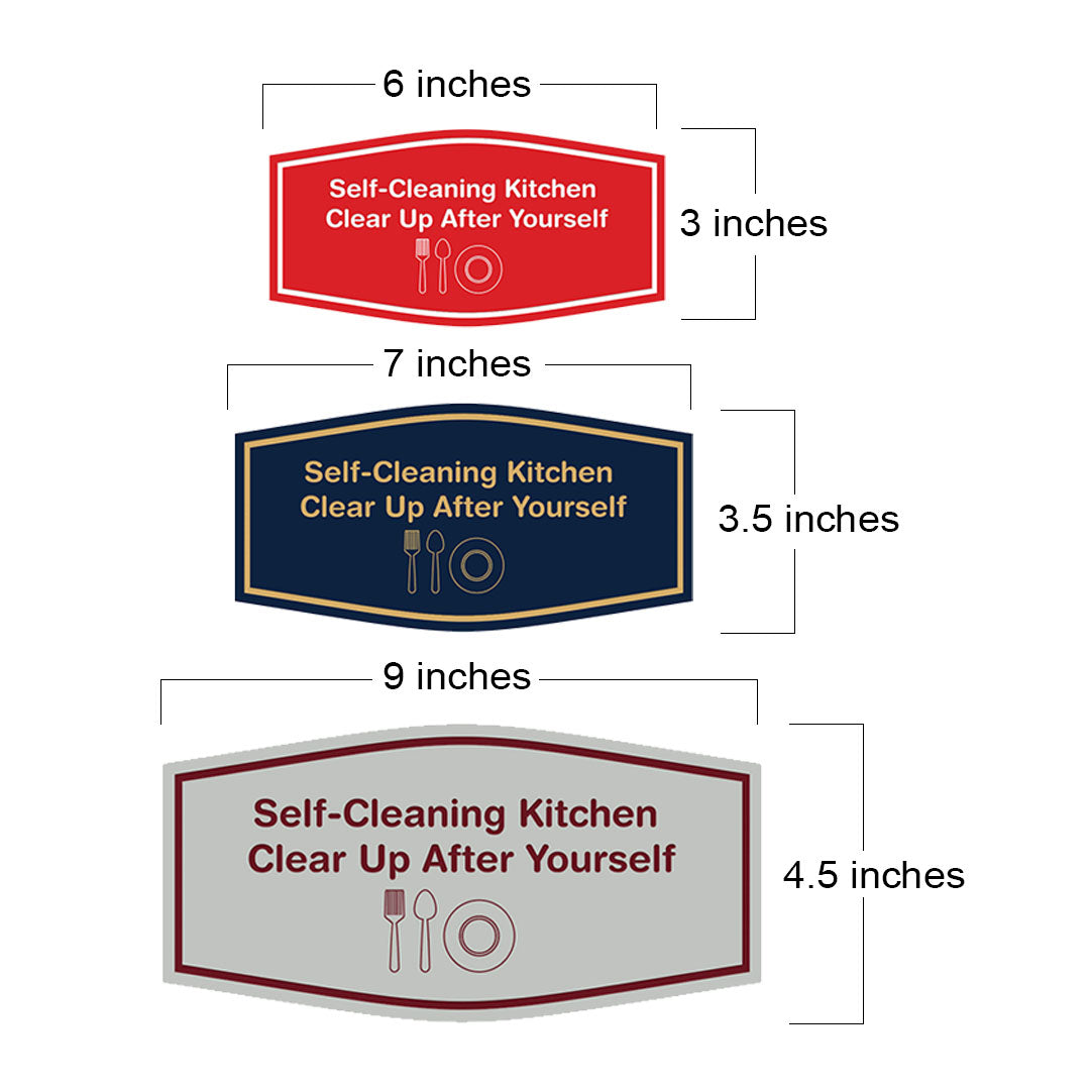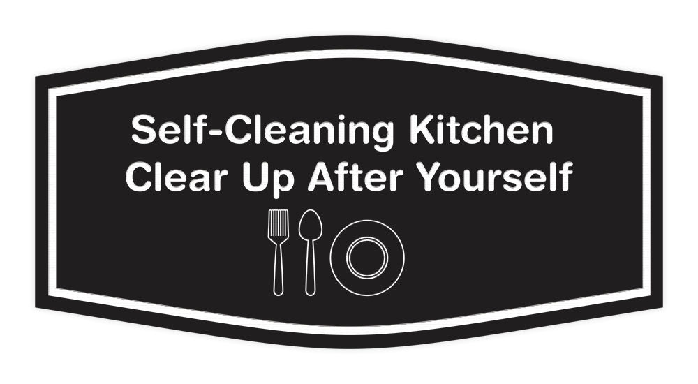 Our Signs ByLITA Fancy Self-Cleaning Kitchen Clear Up After Yourself Vector Easy Sign can be attached to the door, wall or window of your home or business. The sign text and design work is laser engraved into sturdy plastic. Each sign comes with an adhesive foam backing, allowing them to be attached to any flat surface. Comes in multiple colors. Our kitchen signs are great for your business, parlor or shop.