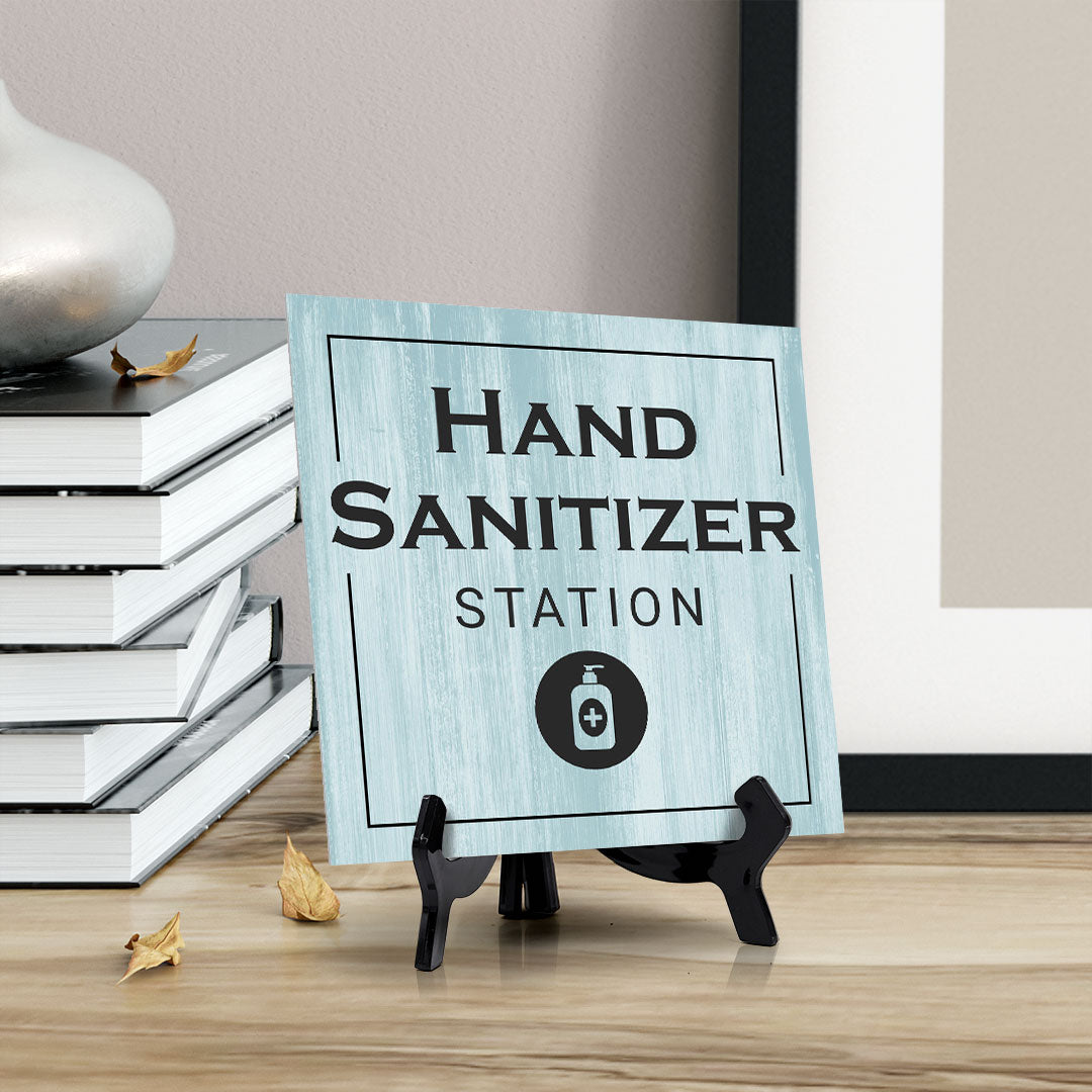 Square Hand Sanitizer Station, Decorative Restroom Table Sign. This table sign comes with it's own black acrylic easel, easy to set up and display on any flat surface.