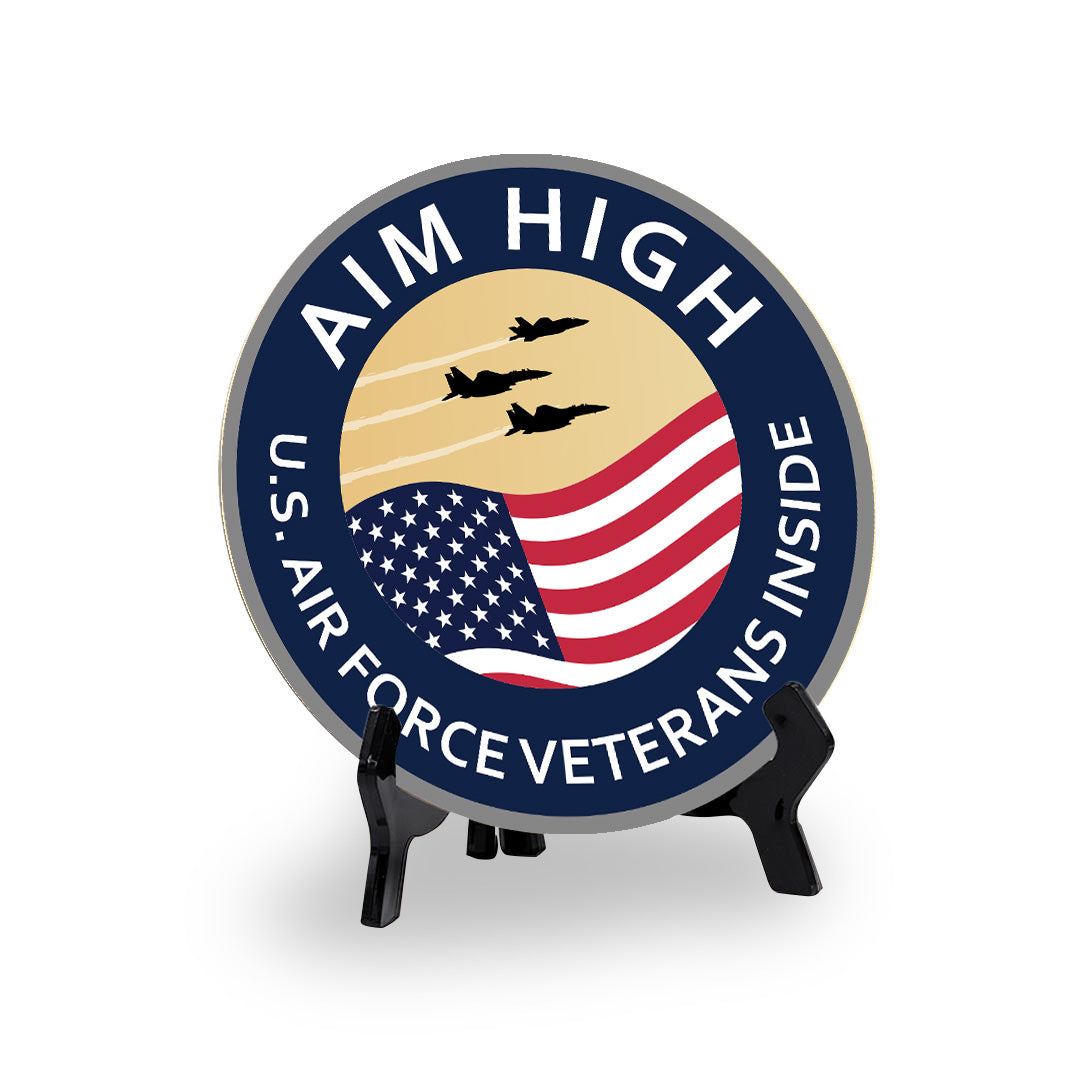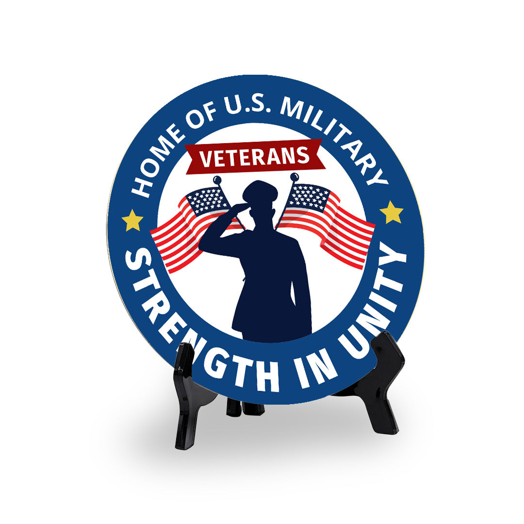 Honor Veterans with Military, Circle Table Sign. This table sign comes with it's own black acrylic easel, easy to set up and display on any flat surface.