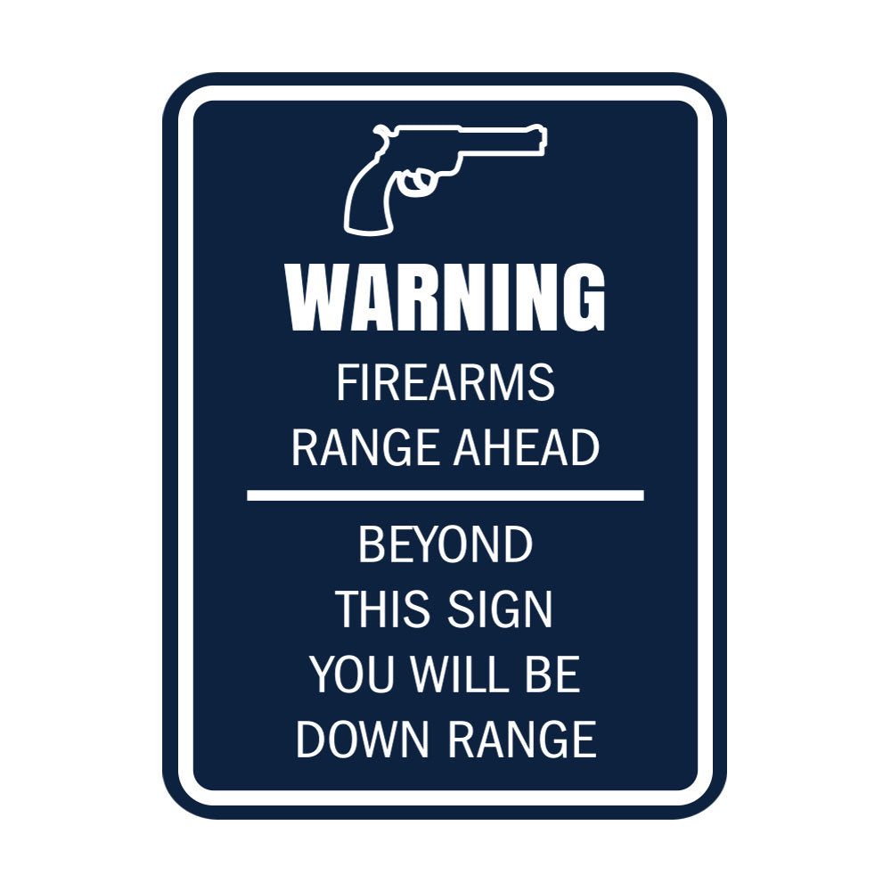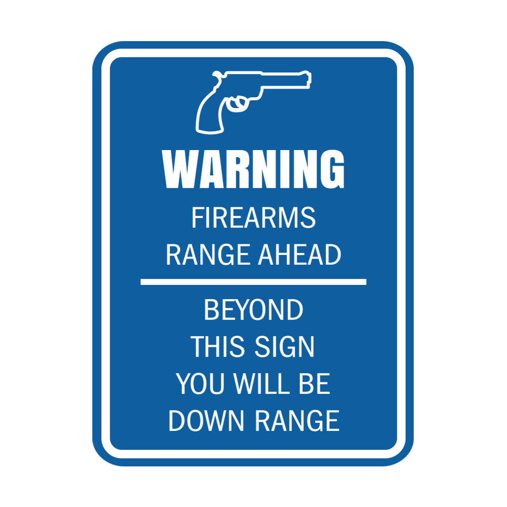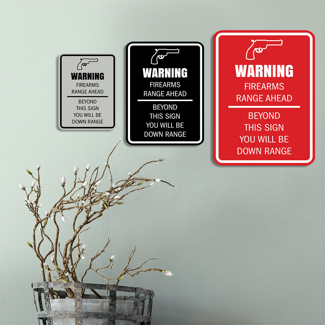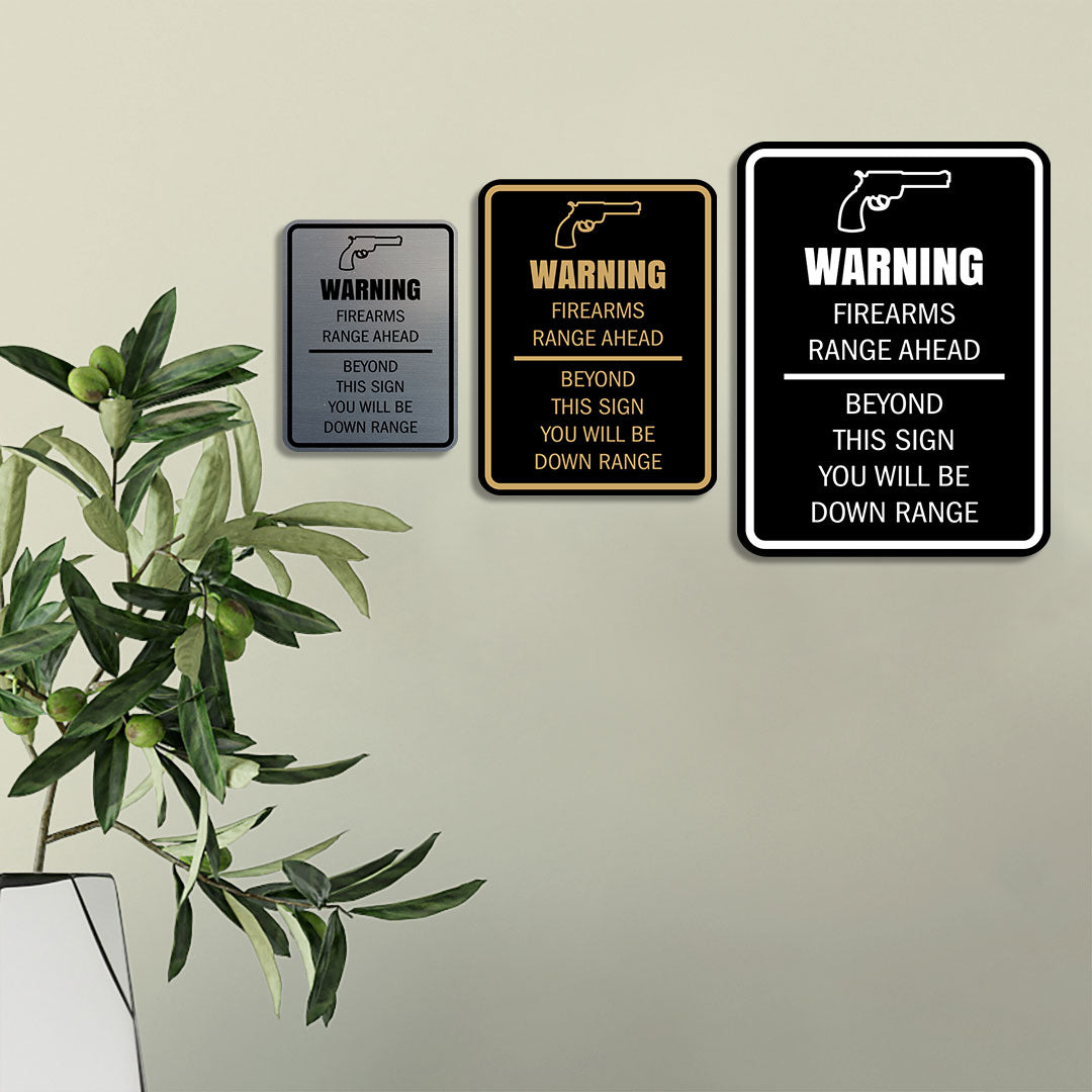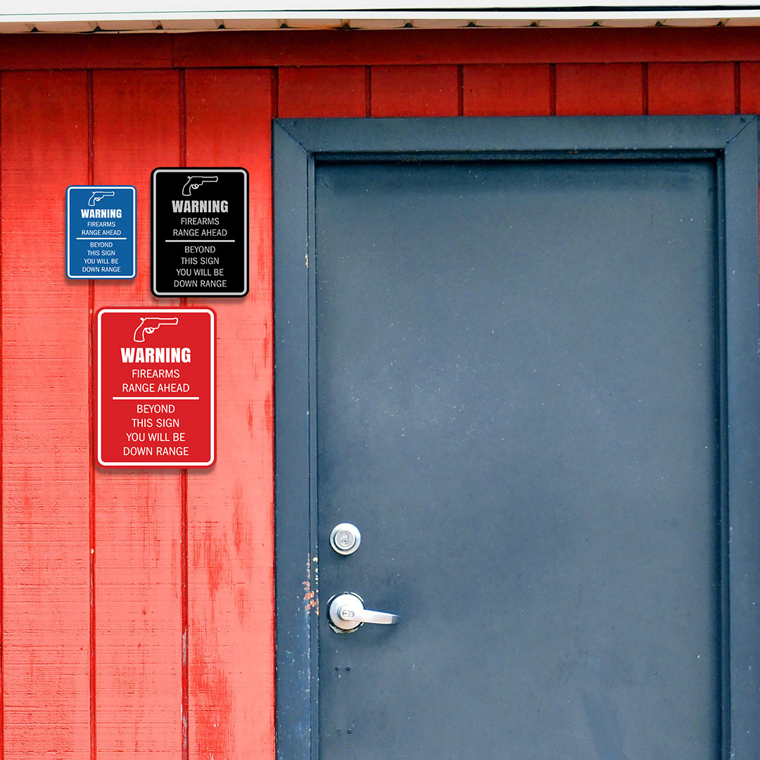 Our Signs ByLITA Portrait Round Warning Firearms Range Ahead Beyond This Sign You Will Be Down Range Door or Wall Sign Easy Installation ' Health And Safety ' Building And Danger Sign can be attached to the door, wall or window of your home or business. The sign text and design work is laser engraved into sturdy plastic. Each sign comes with an adhesive foam backing, allowing them to be attached to any flat surface. Comes in multiple colors. Our fire, housekeeping, gun safety signs are great for your office or business.